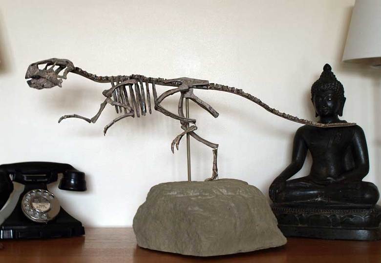 ![]() ![]() This is my pet dinosaur Nim....a psittacosaurus from China. These are pictures the way he appeared when I first bought him. He would require a lot of work, cleaning, mounting, stablizing and so forth.Notice the skull filled with rock for instance.......the ribs lying in a pile. I bought the little guy and hired the lab to get him mounted..the first images they sent were all of possible poses. All showed the dinosaur walking on all fours....I was furious...no no no! They asked me what it was I wanted and i said..I want a 75 pound road runner from hell. This is how it came out... ![]() ![]() ![]() ![]() ![]() ![]() ![]() ![]() The small baggie are rib fragments, and the display case that is flat shows the ribs as a restored them..albeit too fragile to mount on the actual skeleton. the skull once cleaned had some nice teeth remaining that had not been destroyed by fossilization. It had been assumed there would be none, so that was a nice bonus. Nim has 7 sections and can be taken down or set up inside ten minutes. He is 27 inches long, and stands nine inches high at the hips...his back has 64 verts and he would be considered a sub adult that lived about 90 million years ago in China. He is by all measures and means my pride and joy beyond any comic or autograph I own and is mounted in a case that sits two feet from my chair in my living room . |