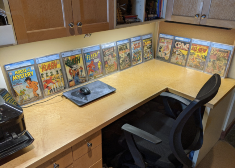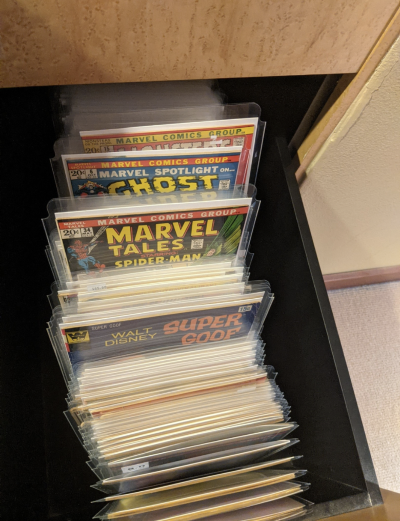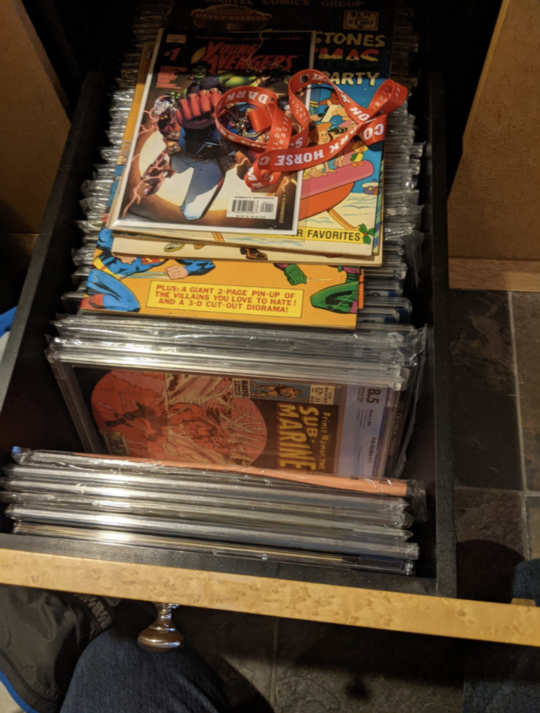 | Front entrance to my condo is dark with no windows, so my computer desk is the perfect place to show some books. There are fluro lights above though I never use them except to take this picture. Also the highest grade is 6.0 so no high grade books left out in the open. ![]() Also I don't use comic boxes for storage. I have pull out drawers that are just slightly smaller than a long box. ![]() ![]() |