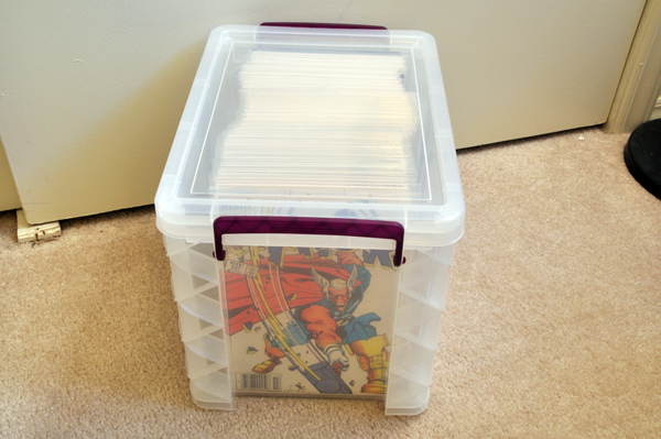 Those bins are great. I have a few that I got at a local office supply store. Light weight and stackable single-piece construction plus lid. I may never buy short boxes again. PS: Super-jeally of your pretty newsstand edition of Thor #337. |