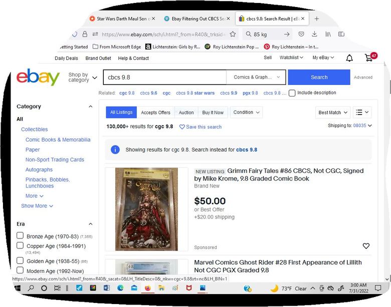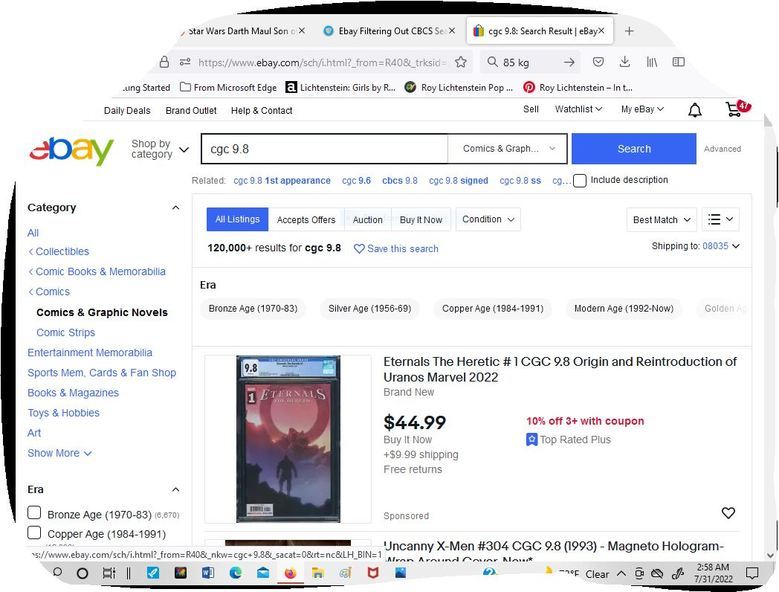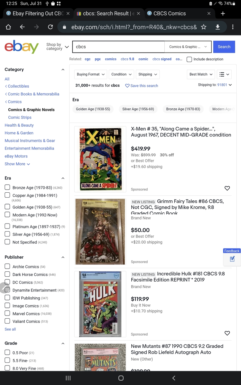| Something is certainly wrong with ebay's tags for searches using for both CGC and CBCS. I searched "CGC 9.8" on ebay's home page (using a full site search i.e. search thru all categories) and did the same under "CBCS 9.8". On both searches, I saw my search redirected instantly within only "comics and graphic novels", despite not selecting that specific category. But the stranger result I saw is that both search results yielded 100,000 more search hits under "CBCS 9.8" than under "CGC 9.8". 130K+ for CBCS 9.8 and 120K+ for CGC 9.8. If anything, there should be at least twice as many search results for CGC 9.8 than CBCS 9.8; CBCS hasn't slabbed nearly as many books as CGC has, as CGC has like a 15 year head start over CBCS. Stranger still, is the first result I got for a "CBCS 9.8" search yielded 140,000+, search hits...100,000+ more than the same result, searched just seconds later....I didnt screenshoot that result but that was all of like 10 to 30 seconds before I followed up with the 2 searches shown in the attached screenshots. ![]() .... ![]() |
