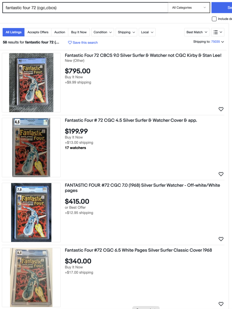 | I always search for both using the (cgc,cbcs) syntax rules... Fantastic Four 72 (cgc,cbcs) ![]() |