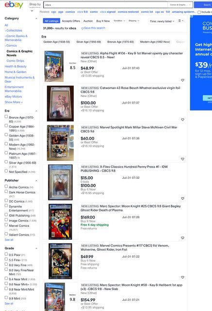 Quote:Originally Posted by SidTheSquid I check ebay every couple of weeks to see if there's any great deals for cbcs books at auction. I think this was probably implemented by Ebay within the last week or so or I would've noticed it earlier. If it continues, I won't be buying or selling on Ebay anymore. It isn't doing the same thing for a "PGX". Do you think CGC also has something to do with this? I'm sure one of the major vendors like MCS that has thousands of CBCS slabs cross listed on Ebay will be made aware of this. I wonder what response they'll receive from Ebay. |