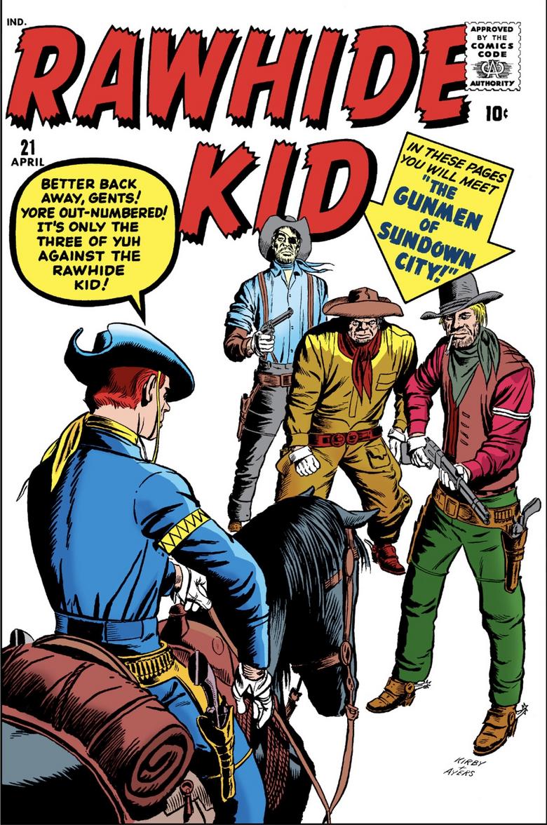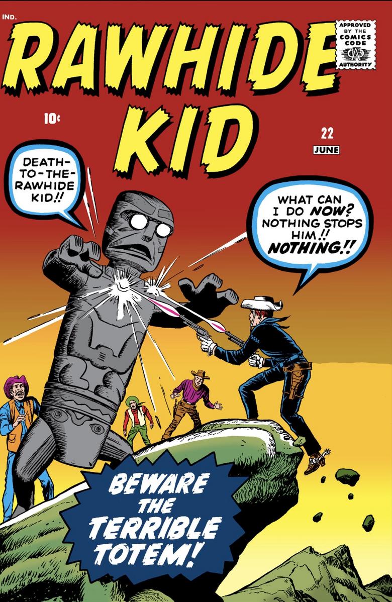 I have at least some of the issues of that Rawhide Kid mini, although not sure if I have them all. I will have to do some digging to be certain. Filing one’s comics in chronological order is great if you want to read them in order, but often presents challenges if you simply want to find something. I have been reading the Rawhide Kid Masterworks on my tablet lately:![]() I definitely recommend these for anyone interested in westerns. The stories by Stan Lee are solid, and the artwork by Kirby and Ayers is excellent. Most of the stories are in the vein of typical westerns: ![]() But the last one I read was an interesting mix of a western and the late 50s/ early 60s Atlas monster comics: ![]() The Kid, on the run from the law, ends up in a mine where, in the deepest shafts, a long buried Indian totem returns to life to terrorize the countryside. Definitely a departure from traditional western fare and an interesting blending of genres. |
