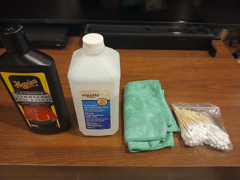 | These are the tools of my trade. Meguiars purchased on Amazon. Rubbing alcohol microfiber chamois cotton swabs I generously douse the sticker area with rubbing alcohol and let soak for 15 minutes or as needed. Gently scrape with a plastic edge (no metal edge or if you must, be very careful and gentle). ***ensure the slab is free of sticker glue or gum*** A quick wipe of the entire front and back using the microfiber chamois with rubbing alcohol. Let fully dry. Apply Meguires somewhat generously (with the microfiber chamois)...rapid wiping. The rapid friction is what gets the scratches out and the shine to appear. ![]() ![]() |