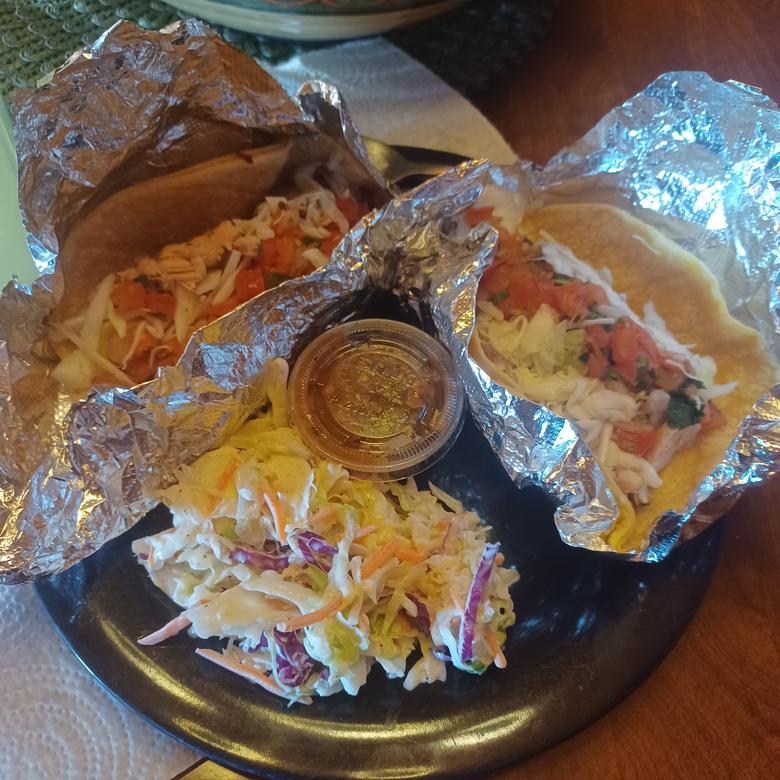 I'm having the fish tacos with some coleslaw I made at home. Alfie is attempting to eat some fish and chips. ![]() ![]() |