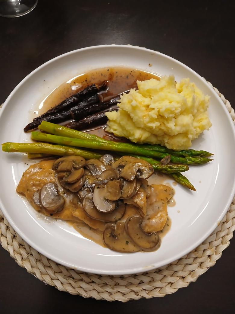 My wife made chicken marsala with garlic mash and veg (heirloom carrots and asparagus) for dinner....it was fantastic.![]() |