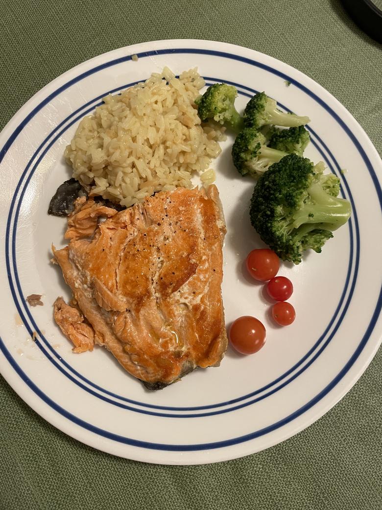 Salmon with rice pilaf, broccoli, and some cherry tomatoes.![]() |