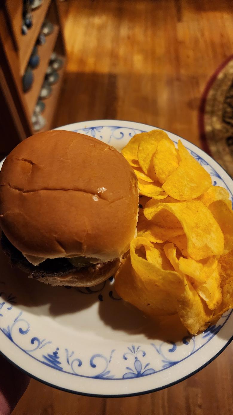 Cheddar Bacon Angus hamburger with Lays Bacon Gilled Cheese potato chips.![]() |