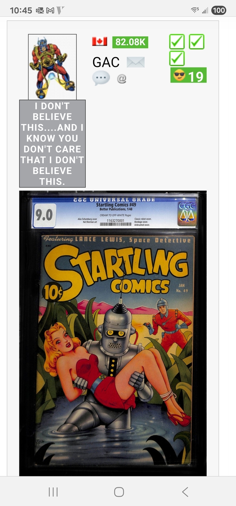 You vote three check marks for your FIRST favorite cover, Two check marks for your SECOND favorite, and One check mark for your THIRD favorite. You do not need to vote for three covers, but it is strongly encouraged!!! However... DO NOT VOTE EARLY!!! (Read on...) Let's have fun with this! A new theme will be chosen each week, so participants must find a comic book that fits the theme. - One entry per person. - Must be real comic books in circulation. - Magazine size books are also okay. - The book does not have to be in your collection. - Variants are acceptable. - The previous winner is allowed to win in this contest. Each week we will vote on who had the best cover. - Friday begins the new contest. - Voting begins Wednesday at 12 noon EST which is the cutoff for submissions. - Voting ends Thursday at 11:59 PM EST. - Please vote through the built-in "three check marks" system described above. - Don't vote early! - The winner will be the cover with the most check marks. - Vote three check marks for your favorite cover, two for your second favorite and one for your third favorite. The winner will choose the next theme and begin a new thread. Note: "The contest winner has 48 hours (by Sunday 9pm EST) to post the new cover contest. If the winner does not post a new cover contest, the 2nd place/runner up contestant can post the new contest." - thanks @GAC In the event of a tie, the deciding factor will be if the entry was of a book in a CBCS slab (only one book in the set needs to be graded; if multiple are CBCS graded then the highest grade applies). If both books are in a CBCS slab (or neither are) then the cover with the most three star votes wins. If they are still tied, then the one with the most 2 star votes wins. If the tie remains, then a sudden death contest will decide the winner. All tied contestants are to enter a new cover based upon the theme of that contest. At 9 pm EST, Friday, the cover with the most votes wins. **Please No Early Voting** We haven't done Robots in along time Pulp or comics ![]() |