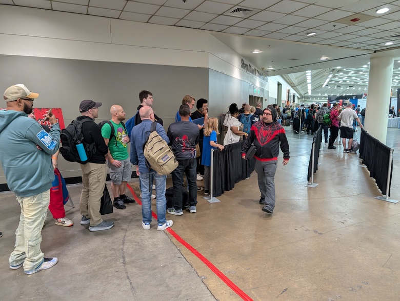 | @xkonk That's nuts. I spent a lot of time in that corner area while Alan Davis was sketching my piece, and they could easily run 3 separate lines going in opposite directions from one another there. Plenty of space along that wall for Davis, the direction towards the gaming area for Kubert, and then back towards the dining area as it is already for Claremont. I'm looking to chance it tomorrow to see if I can get Claremont, but I'm not going to wait 5 hours. | ||