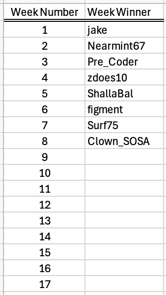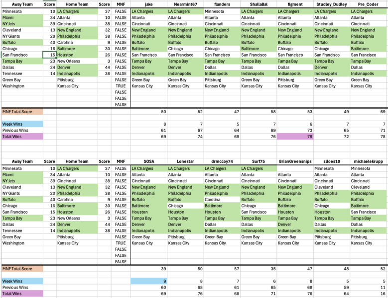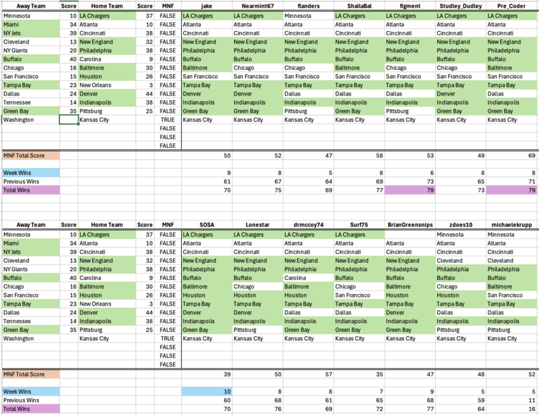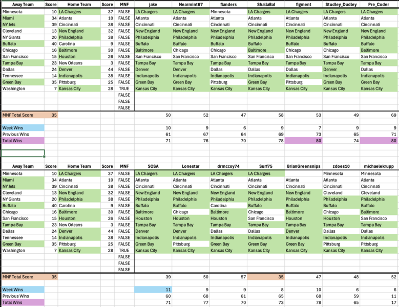 | @Surf75 with the exact MNF score. The clown in exile with the week's win. @Pre_Coder and myself back in a tie for the overall. To Week 9 we go... ![]() |