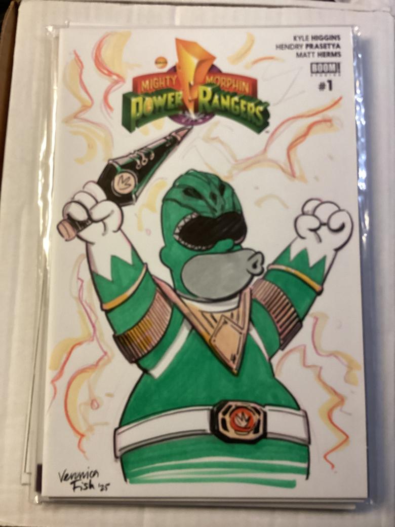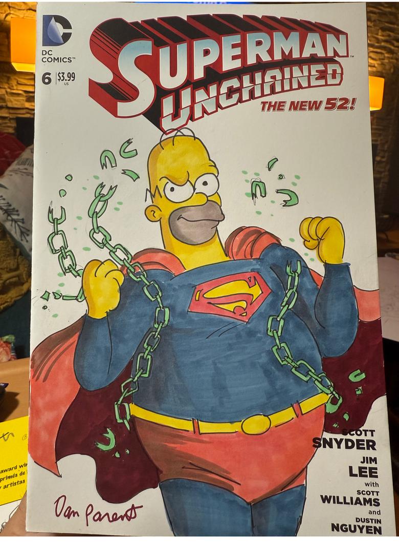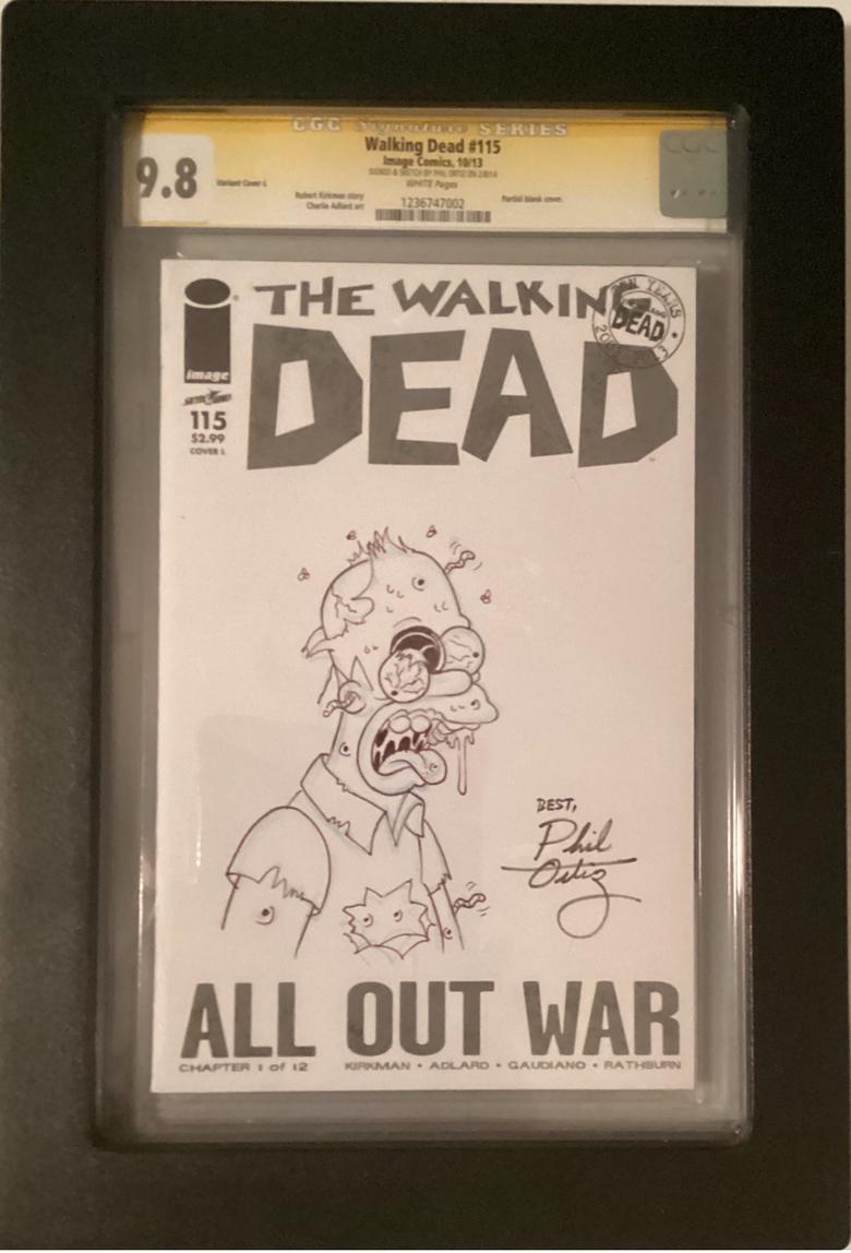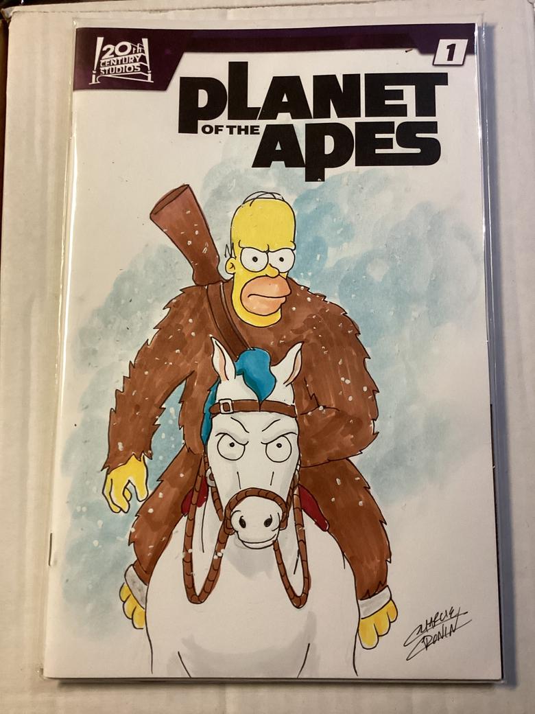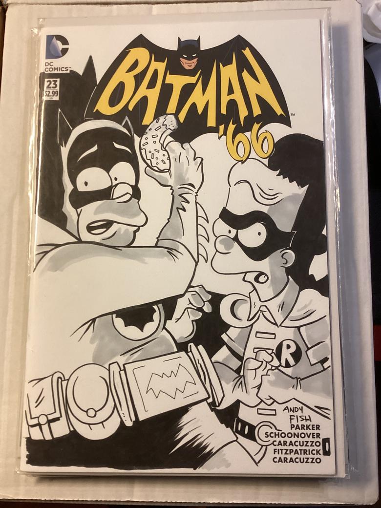 | Every year I go to Heroescon in Charlotte and I’m too old to wait in lines for autographs. I like to go through artists alley and support young talent. A few years ago I had the pleasure of meeting Phil Ortiz at a comic con and had him do a blank sketch cover of Homer Simpson as a zombie on a walking dead cover. It is a favorite of mine. This year I had commissions done. Homer,Simpson as….. I let the artist pick the blank sketch cover from about 15 I had brought. They all loved the idea. It allowed them to do something different. Veronica and Andy Fish are family so I let them pick the covers and sent it to them, ![]() ![]() ![]() ![]() ![]() ![]() ![]() The Batman 66 had a blank back cover. Andy Fish added Krusty as the Joker along with the comment. If you notice the hint of a mustache under the makeup. Inspired! |