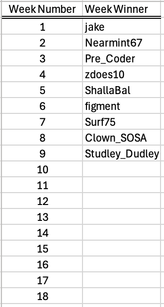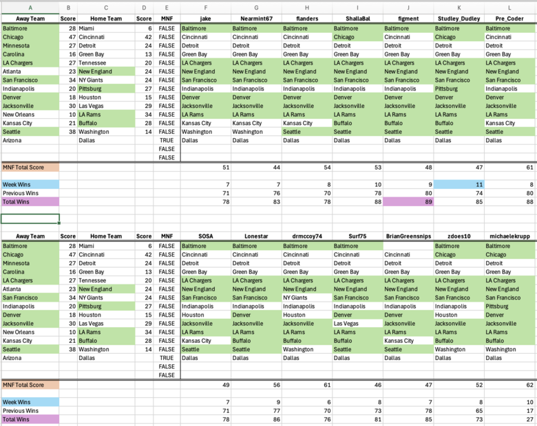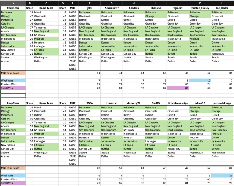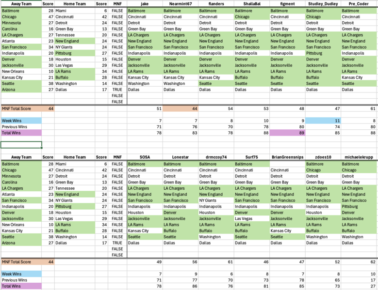 | Tonight's Seattle/Washington game will determine the weekly winner between @Studley_Dudley and @michaelekrupp. The Dallas/Arizona game is meaningless except for the MNF point total. @Pre_Coder gets his wish for the overall, it's mine once again going into Week 10. ![]() |