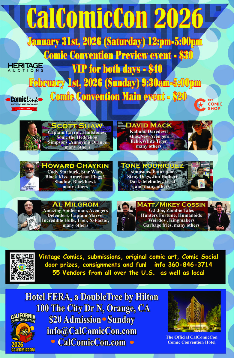 | California Comic Convention - 2026 Event The California Comic Convention is celebrating its 18thth year at the Hotel Fera in Orange County, CA on Saturday January 31st & Sunday February 1st, 2026 This event will focus on vintage comics and comic book art. Dozens of dealers from across the U.S. will offer a large selection of items sought-after by collectors and investors. Guest Artist will be signing and available on both show dates. CGC graded comics, original comic book pages, guest artist sketches. Door prize In addition, we will be giving away dozens of valuable items throughout the day including Sketches from our guest artists. (included with admission, “no purchase necessary” to win*) Date and Time January 31st, 2026 (Saturday) 12:pm-5:00pm Comic Convention Preview event - $30 VIP for both days - $40 February 2nd, 2026 (Sunday) 9:30am-5:00pm Comic Convention Main event - $20 Location at the Hotel Fera Anaheim, a DoubleTree by Hilton 100 The City Drive S, Orange, California 92868-3204 USA Parking is $12 Admission $40 Advance ticket purchases are available online at: Tickets January 31st, 2026 (Saturday) 7-11pm Comic book social - $10 suggested The Social Lounge, Hotel Fera hotel lobby bar area for more info: CalComicCon |