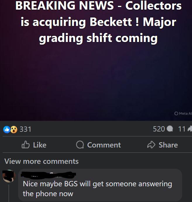 | per chatgpt Here are the main known / publicly stated details of PSA’s parent company (Collectors) acquiring Beckett: • Who’s buying whom: Collectors (owner of PSA, plus PCGS, SGC, Card Ladder) said it has entered into a definitive agreement to acquire Beckett.  • When it was announced: December 15, 2025 (press release dated Santa Ana, CA).  • How Beckett will operate: Collectors says Beckett will remain an independent brand within its portfolio, keeping its own operations, customer experience, and grading standards, and continuing its activities across grading, marketplace, magazines, and price guide.  • What changes immediately (per the announcement): • Orders at PSA and Beckett expected to be processed normally • No pricing changes as part of the acquisition  • Operational separation (reported): Sources cited by cllct say PSA and Beckett will not share grading staff, grading remains separate, and crossover grading won’t be impacted.  • Seller / prior ownership context: cllct reports Collēctīvus Holdings became Beckett’s parent in December 2024, and that Dragon Shield is not part of the acquisition (per sources).  • Financial terms / closing timing: The public announcement (Collectors release) does not disclose price/valuation, and it doesn’t provide much detail on timing to close beyond the fact it’s a signed agreement.  |