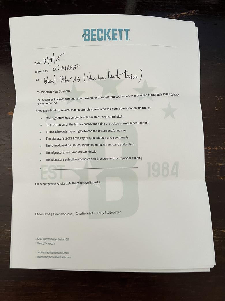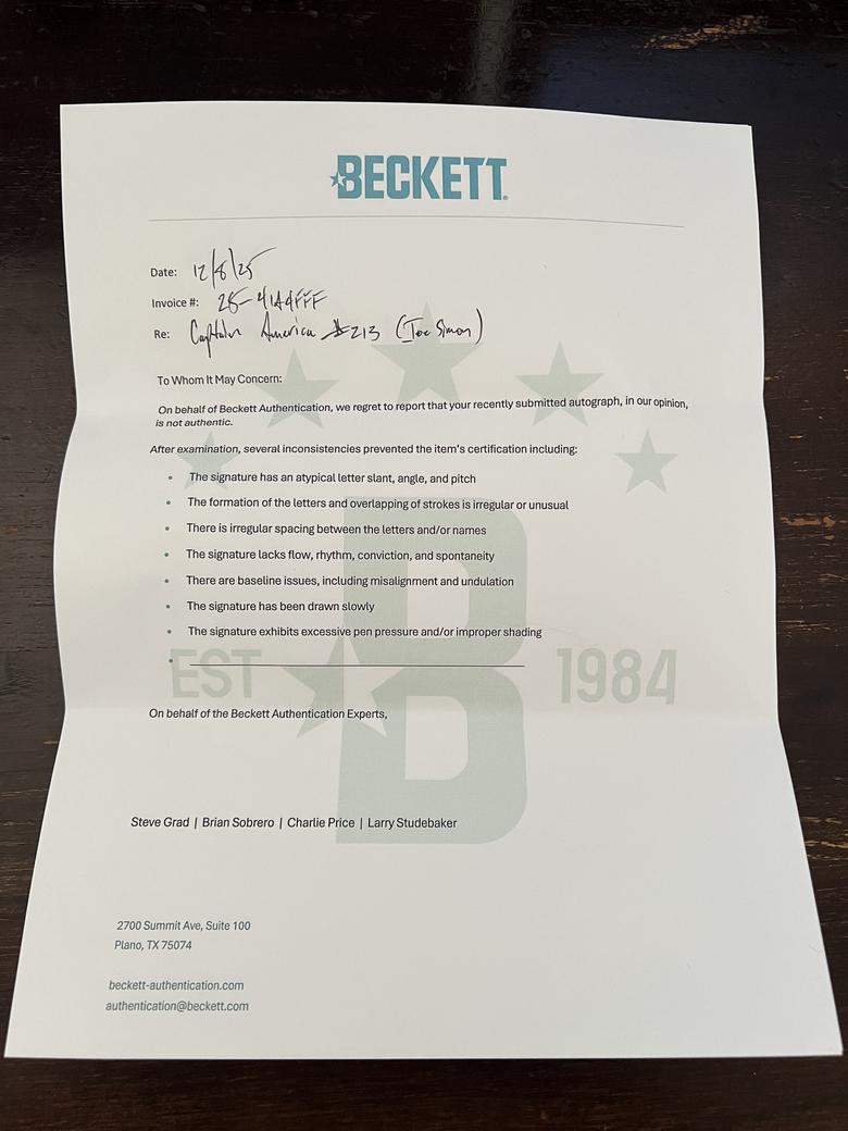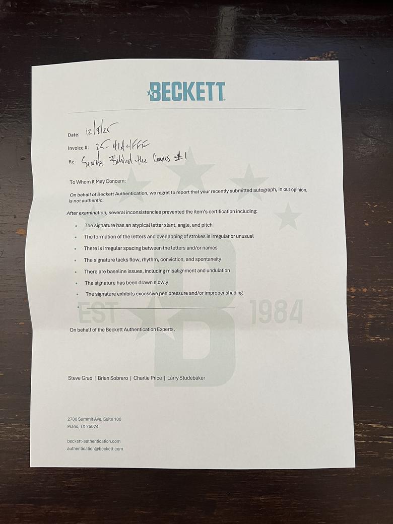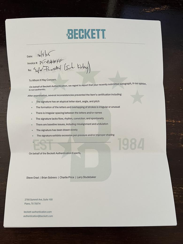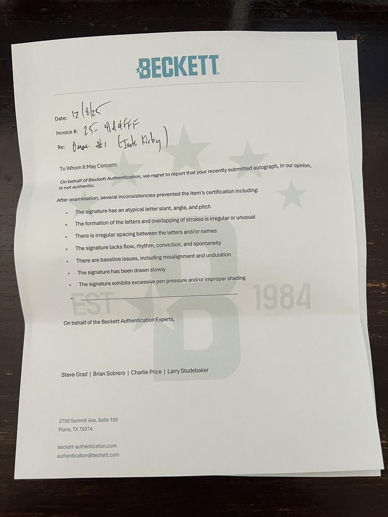 Quote:Originally Posted by TheShocker Beckett believes the signatures are not authentic and provides same standard letter for all |