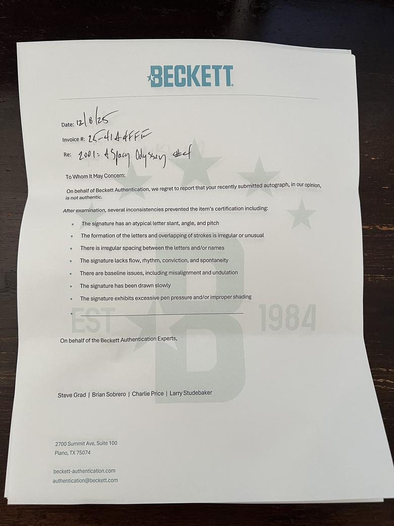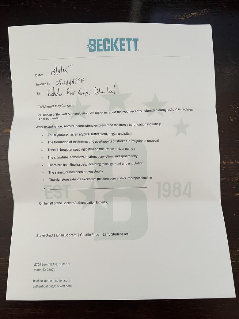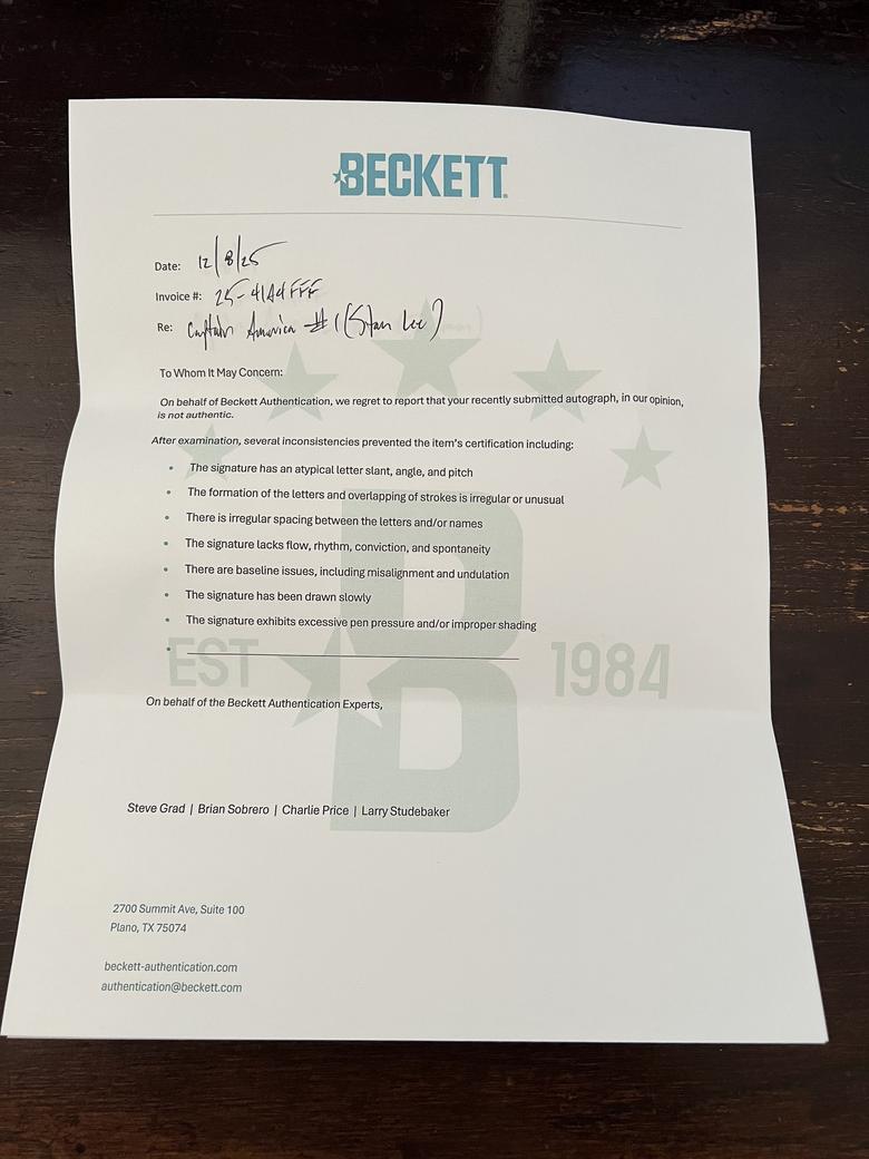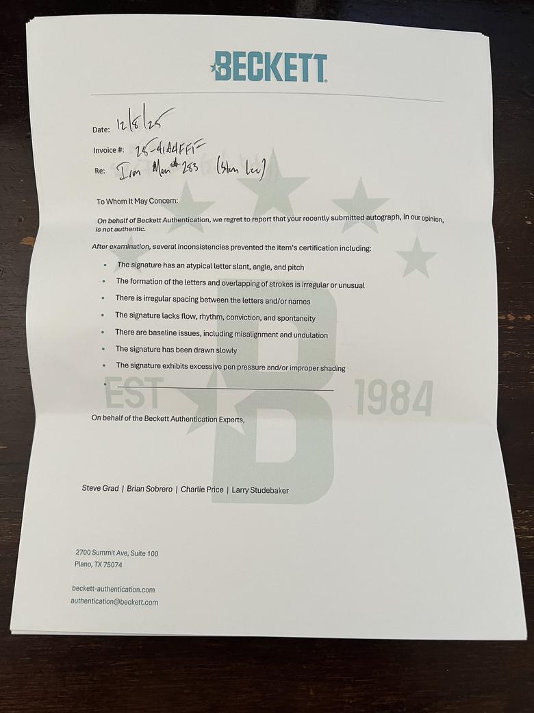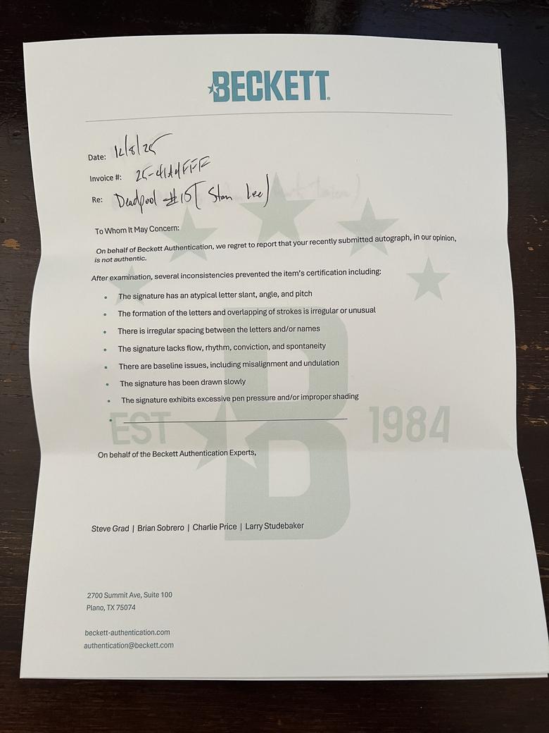Quote:Originally Posted by TheShocker Beckett believes the signatures are not authentic and provides same standard letter for all |