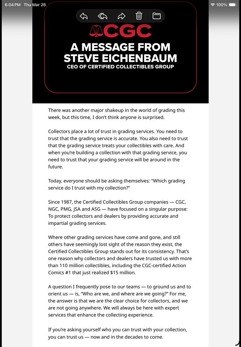 | Dang, did CGC just throw a dig at CBCS? “ There was another major shakeup in the world of grading this week, but this time, I don’t think anyone is surprised.”. ![]() |