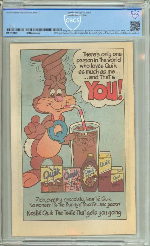 | I just sent my action #1 nestle's reprint in for a press and grade. I also have my original "superman meets the quick bunny" issue too (not sent in). I won't get a 9.8 as I believe the "holes" along the bottom (you can see them along the back of your copy) are also through the front cover. I also have the 50th anniversary reprint as well...both my copies have a weird manufacturing ink "stain" on their backs..probably rubbed off from the adjacent comics it was up against when packaged/stored. Not sure how much it's going to cost me...ill have to post them when they return in 3 months. | ||